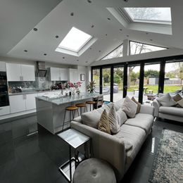 Contemporary family home available in Gidea Park, Essex. Wrapped in warm, natural lighting, this tastefully modern design boasts a quirky entrance hall, large garden and double volume kitchen / living area.
